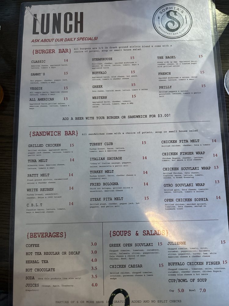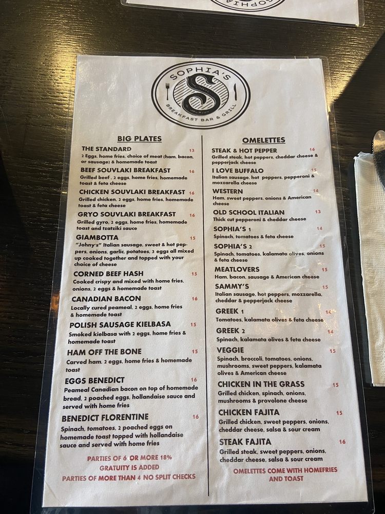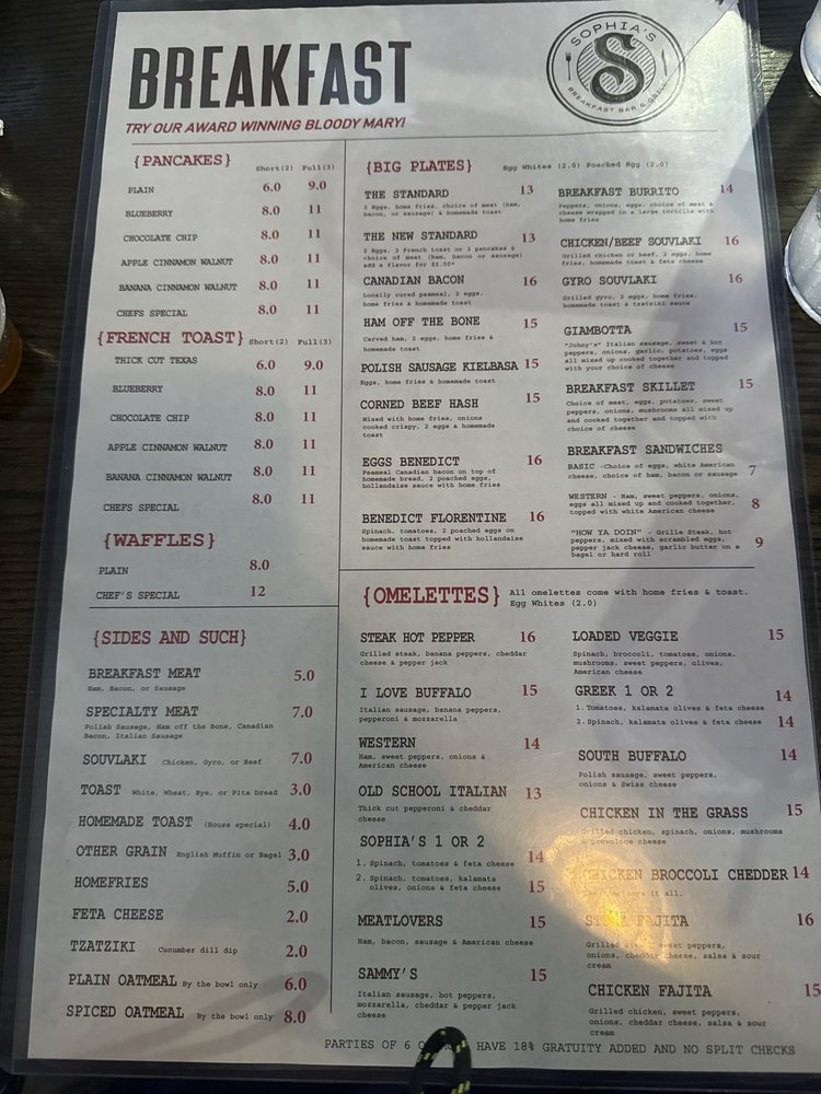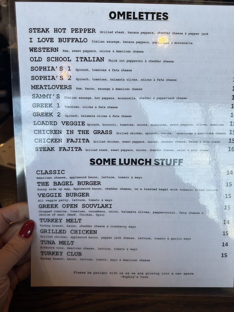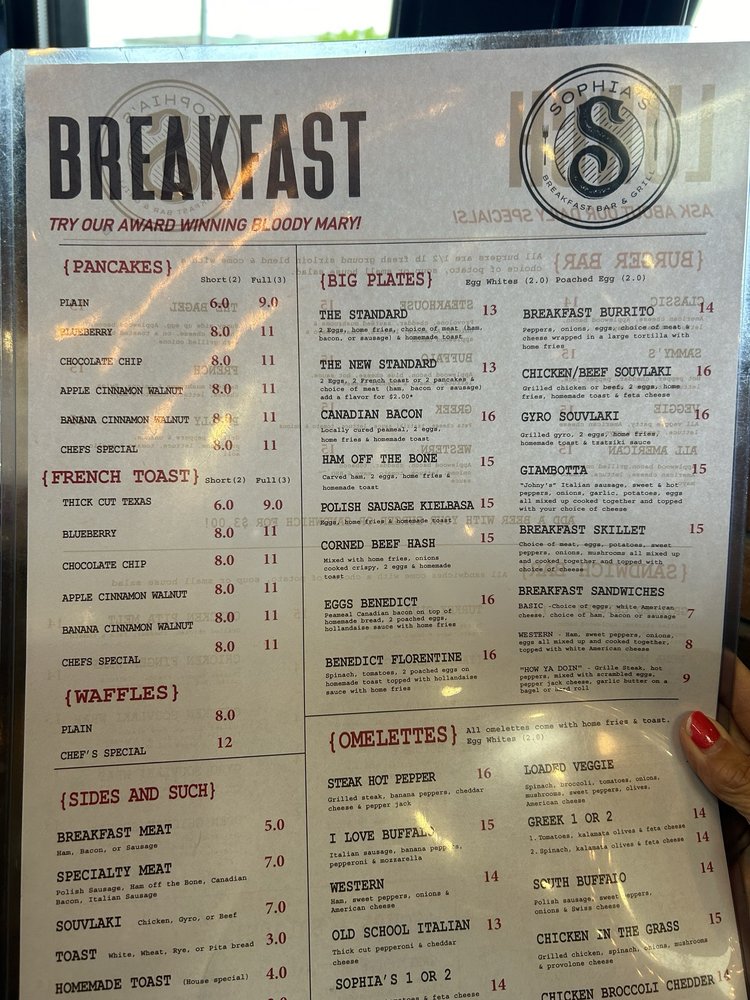 “ Sophia's Outstanding restaurant food outstanding service outstanding. I had a pepper and steak omelette with fried potatoes. Everything was perfect The only problem I had was noise level was extreme. So if you're going to go there and have a nice breakfast which you will and have a nice conversation with the people in your party, bring a bull horn I am definitely going back for breakfast again. Their menu was so big everything looked scrumptious ”