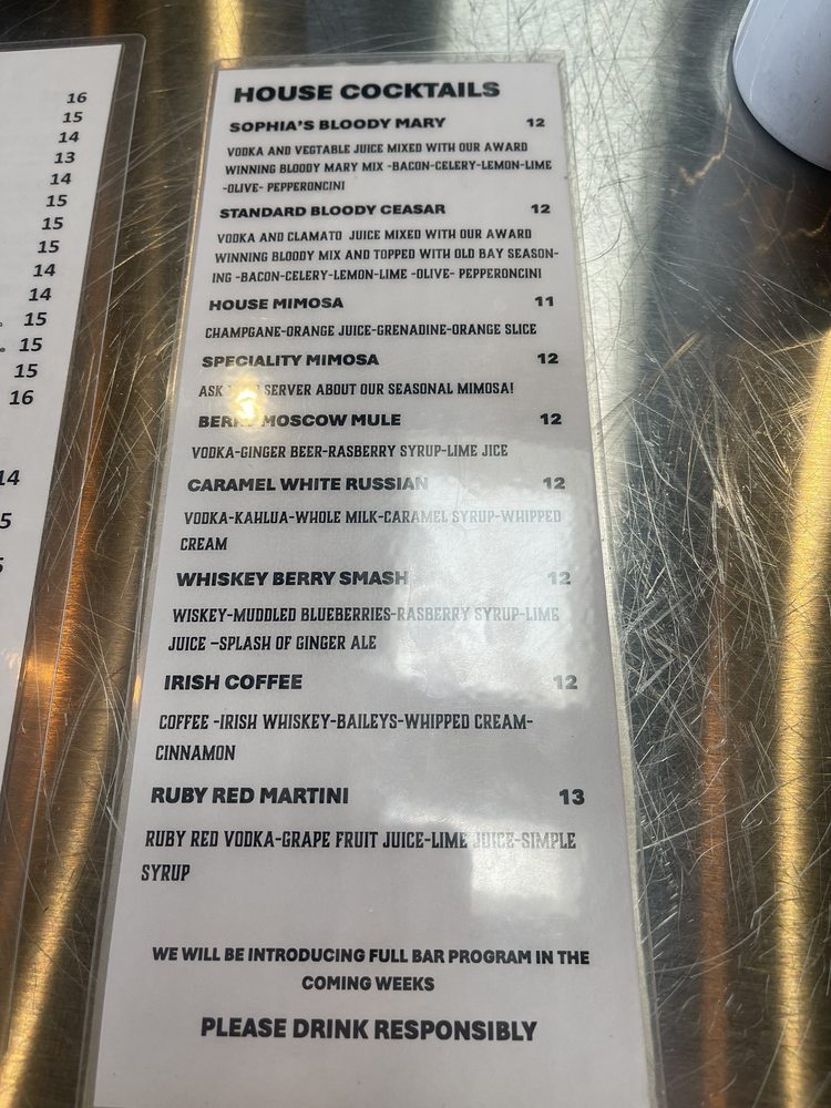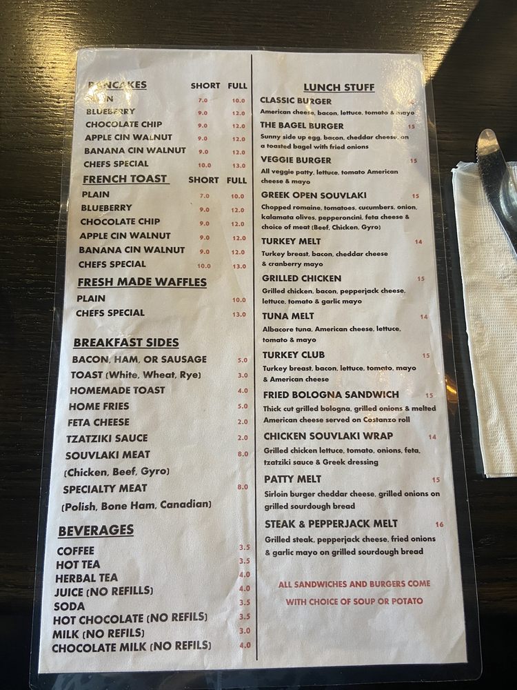 “ Jeremy, our server, was so pleasant. He said he loves first-time visitors. He offered his recommendations (favorites) from both the breakfast and lunch menu. Of the three of us dining, one ordered the standard, one ordered the fried bologna with a cup of tortellini Florentine soup and I had the bloody Mary with the steak pita and a side salad. The Bloody Mary was spicy & delicious, with a piece of bacon, an olive, a pepperoncini, celery, and slices of lemon & lime. I would have liked feta cheese on my salad, but there was more than enough cheese in my steak pita to make up for it. I would definitely come back. ”