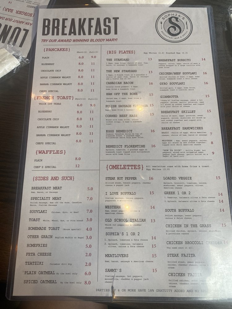 “ Floofiest pancakes I've had in a while and just a lovely brunch! I recently tried Sophia's for the first time and was really happy with my experience. I went for brunch on a weekday and there was a short wait, which is a great sign! Often brunch spots are dead mid-week, but this place is clearly popular. We were seated after 15-mins and were offered drinks and provided menus. There was a full suite of breakfast and lunch options. I desperately wanted pancakes, but didn't want pancakes exclusively. Fortunately, they had some combo options that fit the bill. I was allowed to sub in home fries for the meat, so I was a happy camper! The home fries were great with just a tiny bit of grease to make them tasty. I did have to salt my eggs, but they nailed the over medium cook. The pancakes were spectacular. I was only able to eat one of the pancakes on spot, but the other one did NOT go to waste. The restaurant space was a step up from a typical greasy spoon environment. We had a comfortable half-booth, half-table. Families and friend groups were happily dining in the spacious dining room. There was also a large covered patio, but it wasn't open when we visited. Overall, Sophia's is a solid brunch option! Go get those pancakes! ”